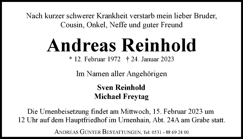 Hier finden Sie alle Traueranzeigen aus der Zeitung, die bisher für Andreas Reinhold erschienen sind. Weitere Traueranzeigen, die in der Zeitung erscheinen, werden hier ebenfalls aufgelistet