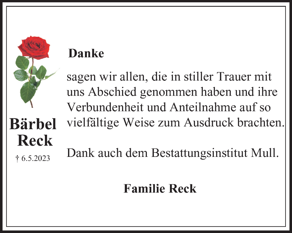 Hier finden Sie alle Traueranzeigen aus der Zeitung, die bisher für Bärbel Reck erschienen sind. Weitere Traueranzeigen, die in der Zeitung erscheinen, werden hier ebenfalls aufgelistet