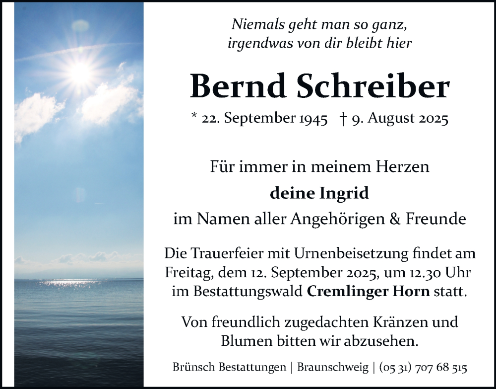 Hier finden Sie alle Traueranzeigen aus der Zeitung, die bisher für Bernd Schreiber erschienen sind. Weitere Traueranzeigen, die in der Zeitung erscheinen, werden hier ebenfalls aufgelistet