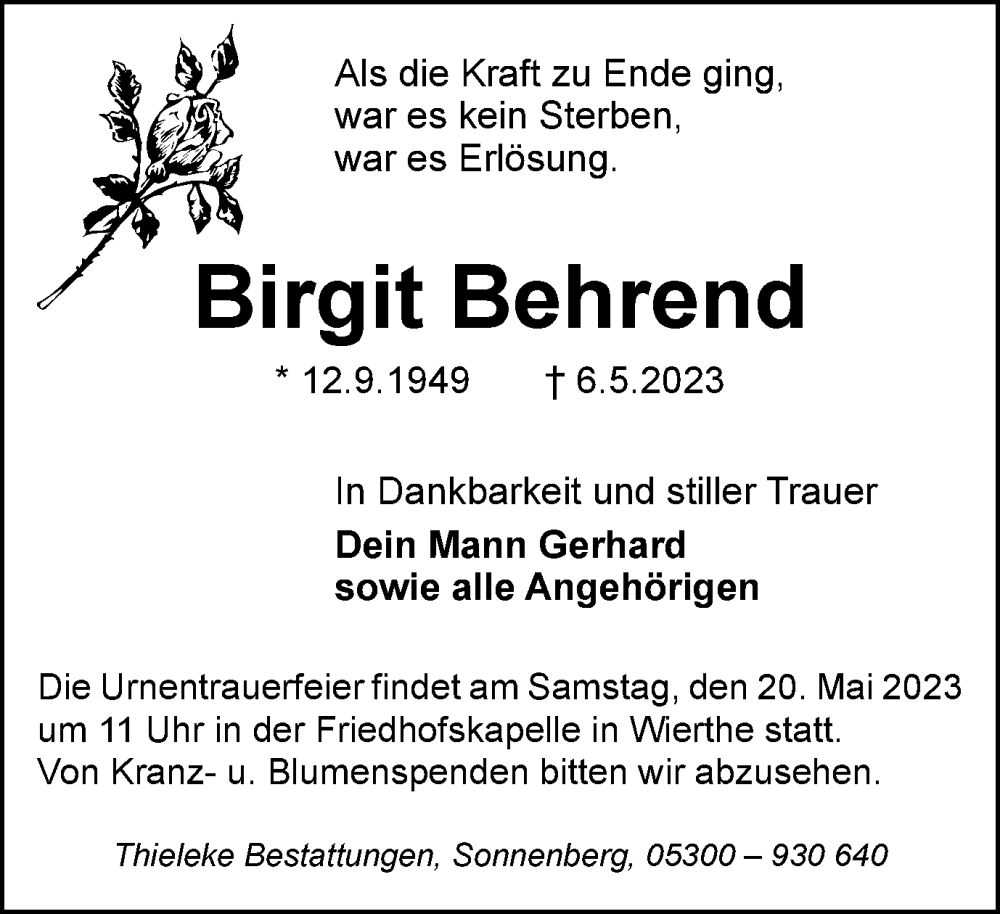 Hier finden Sie alle Traueranzeigen aus der Zeitung, die bisher für Birgit Behrend erschienen sind. Weitere Traueranzeigen, die in der Zeitung erscheinen, werden hier ebenfalls aufgelistet