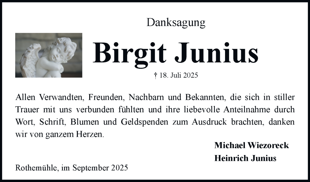 Hier finden Sie alle Traueranzeigen aus der Zeitung, die bisher für Birgit Junius erschienen sind. Weitere Traueranzeigen, die in der Zeitung erscheinen, werden hier ebenfalls aufgelistet