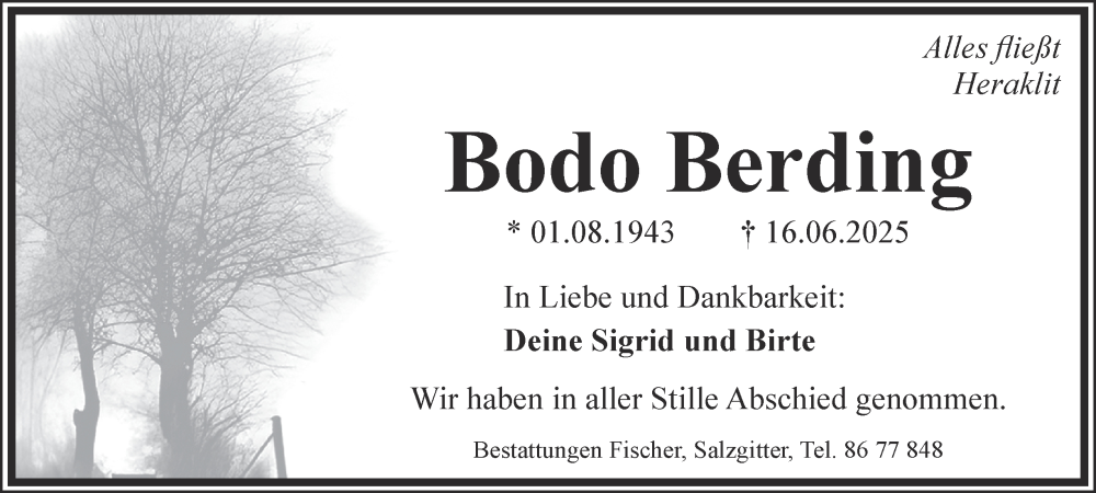 Hier finden Sie alle Traueranzeigen aus der Zeitung, die bisher für Bodo Berding erschienen sind. Weitere Traueranzeigen, die in der Zeitung erscheinen, werden hier ebenfalls aufgelistet