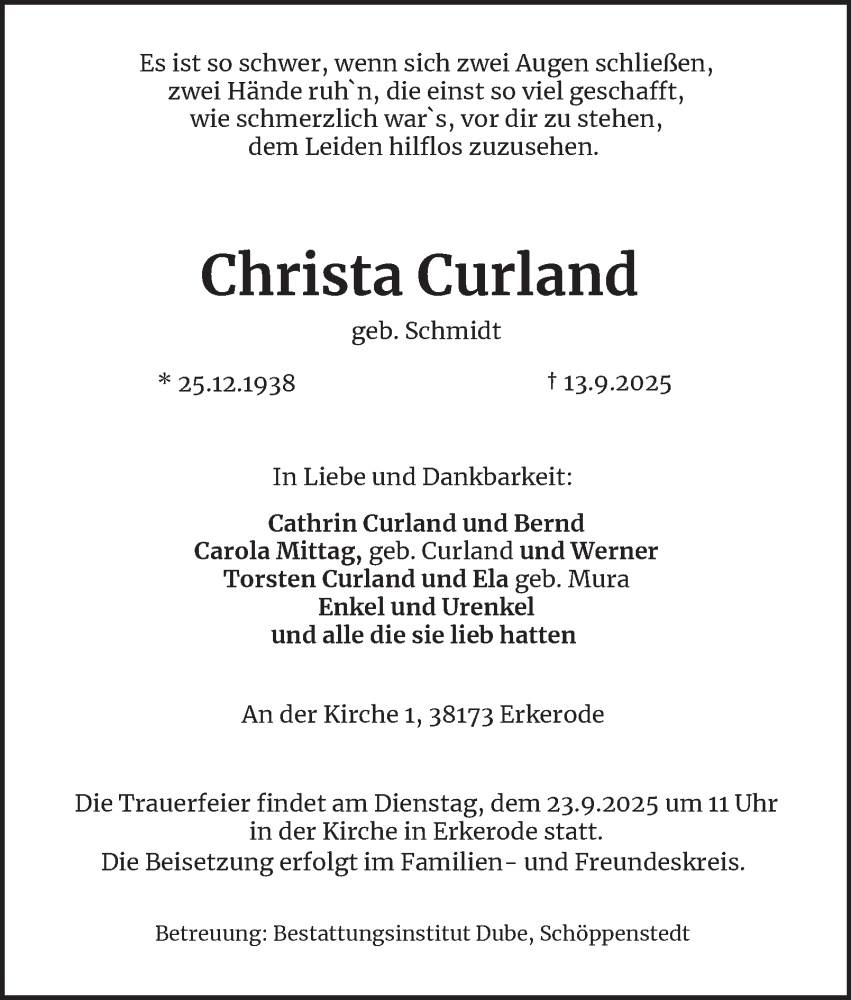 Hier finden Sie alle Traueranzeigen aus der Zeitung, die bisher für Christa Curland erschienen sind. Weitere Traueranzeigen, die in der Zeitung erscheinen, werden hier ebenfalls aufgelistet