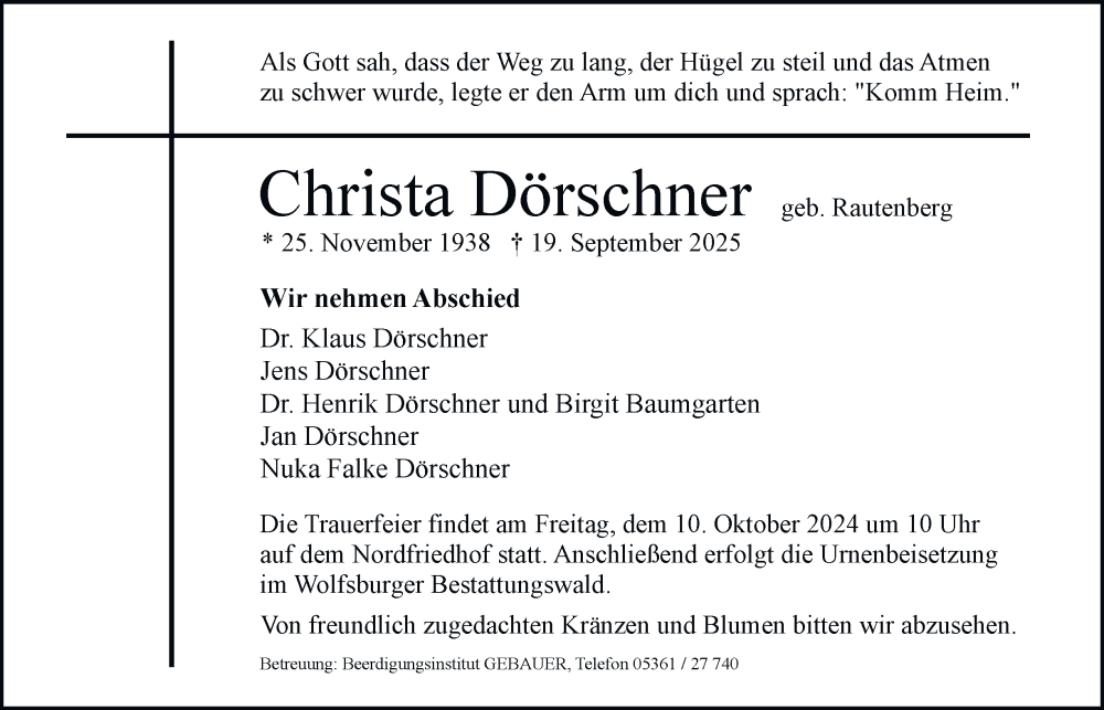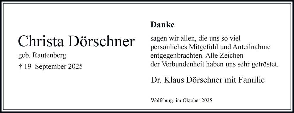 Hier finden Sie alle Traueranzeigen aus der Zeitung, die bisher für Christa Dörschner erschienen sind. Weitere Traueranzeigen, die in der Zeitung erscheinen, werden hier ebenfalls aufgelistet