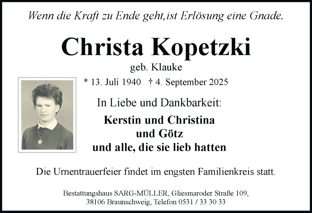 Hier finden Sie alle Traueranzeigen aus der Zeitung, die bisher für Christa Kopetzki erschienen sind. Weitere Traueranzeigen, die in der Zeitung erscheinen, werden hier ebenfalls aufgelistet