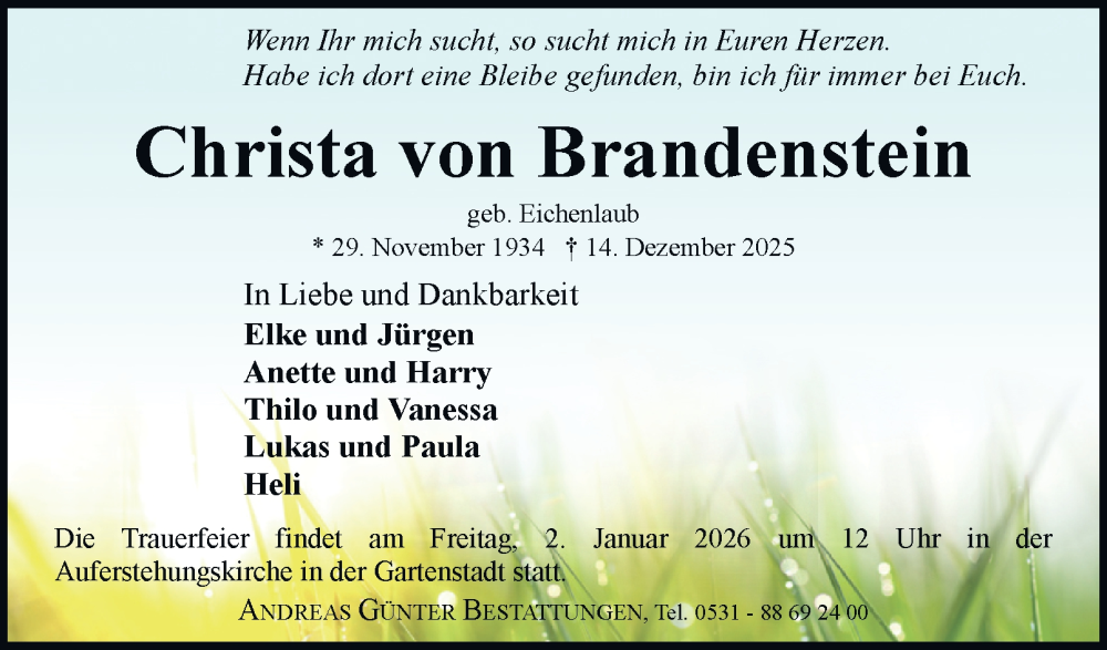 Hier finden Sie alle Traueranzeigen aus der Zeitung, die bisher für Christa von Brandenstein erschienen sind. Weitere Traueranzeigen, die in der Zeitung erscheinen, werden hier ebenfalls aufgelistet