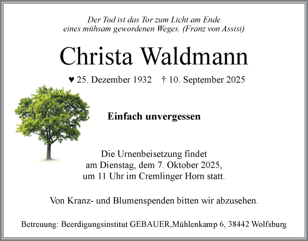 Hier finden Sie alle Traueranzeigen aus der Zeitung, die bisher für Christa Waldmann erschienen sind. Weitere Traueranzeigen, die in der Zeitung erscheinen, werden hier ebenfalls aufgelistet