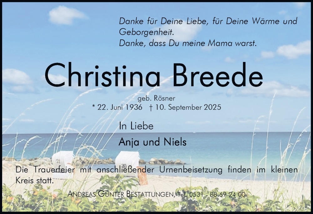 Hier finden Sie alle Traueranzeigen aus der Zeitung, die bisher für Christina Breede erschienen sind. Weitere Traueranzeigen, die in der Zeitung erscheinen, werden hier ebenfalls aufgelistet