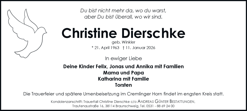 Hier finden Sie alle Traueranzeigen aus der Zeitung, die bisher für Christine Dierschke erschienen sind. Weitere Traueranzeigen, die in der Zeitung erscheinen, werden hier ebenfalls aufgelistet