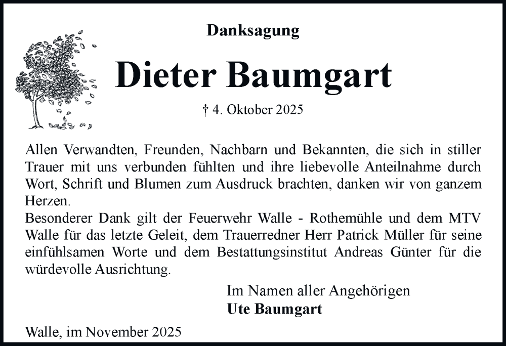 Hier finden Sie alle Traueranzeigen aus der Zeitung, die bisher für Dieter Baumgart erschienen sind. Weitere Traueranzeigen, die in der Zeitung erscheinen, werden hier ebenfalls aufgelistet