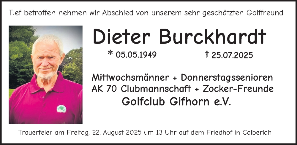 Hier finden Sie alle Traueranzeigen aus der Zeitung, die bisher für Dieter Burckhardt erschienen sind. Weitere Traueranzeigen, die in der Zeitung erscheinen, werden hier ebenfalls aufgelistet