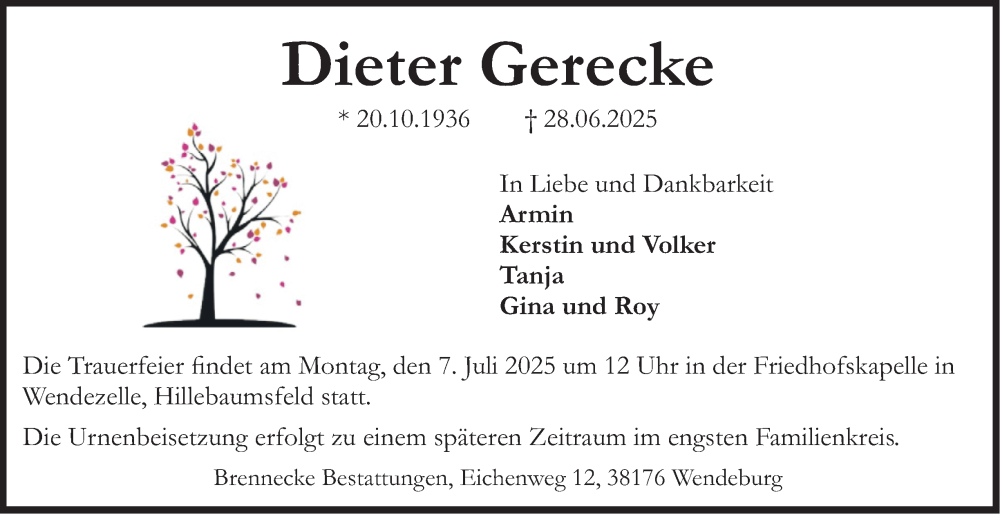 Hier finden Sie alle Traueranzeigen aus der Zeitung, die bisher für Dieter Gerecke erschienen sind. Weitere Traueranzeigen, die in der Zeitung erscheinen, werden hier ebenfalls aufgelistet