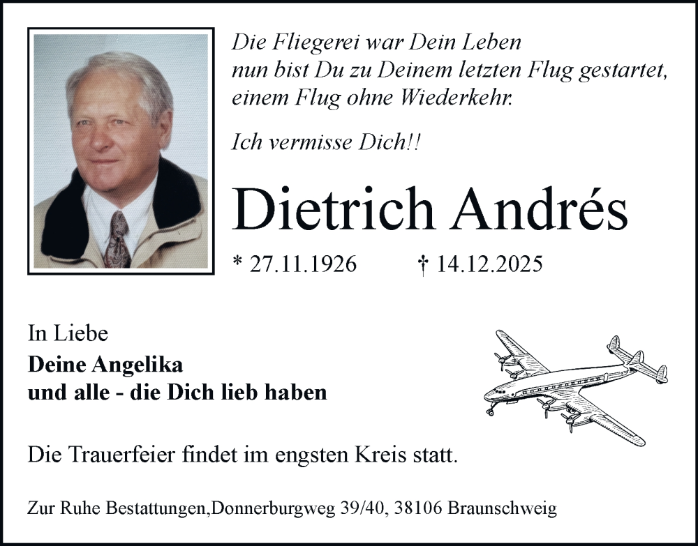 Hier finden Sie alle Traueranzeigen aus der Zeitung, die bisher für Dietrich Andrés erschienen sind. Weitere Traueranzeigen, die in der Zeitung erscheinen, werden hier ebenfalls aufgelistet