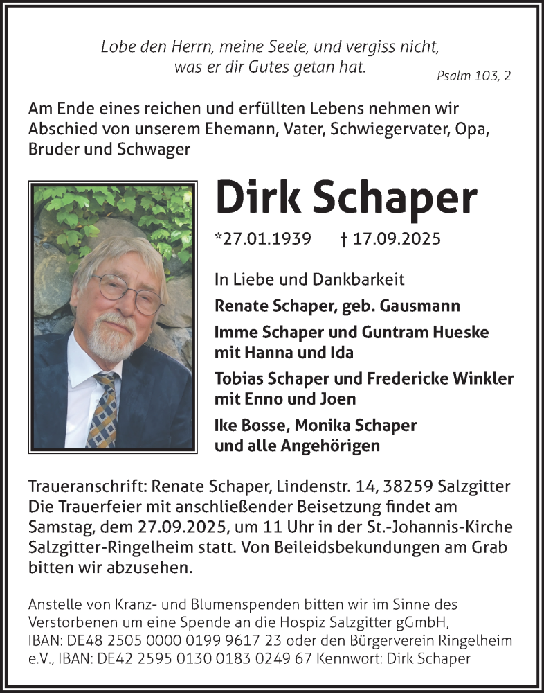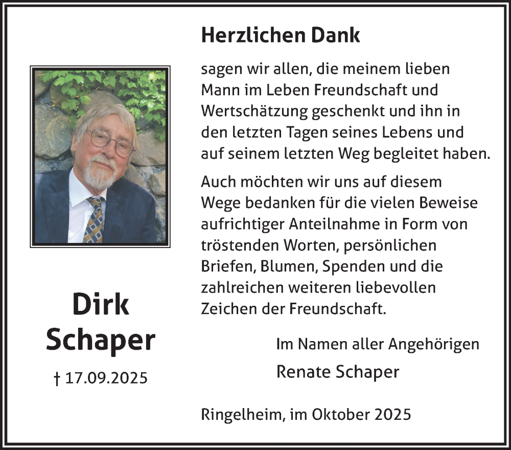 Hier finden Sie alle Traueranzeigen aus der Zeitung, die bisher für Dirk Schaper erschienen sind. Weitere Traueranzeigen, die in der Zeitung erscheinen, werden hier ebenfalls aufgelistet