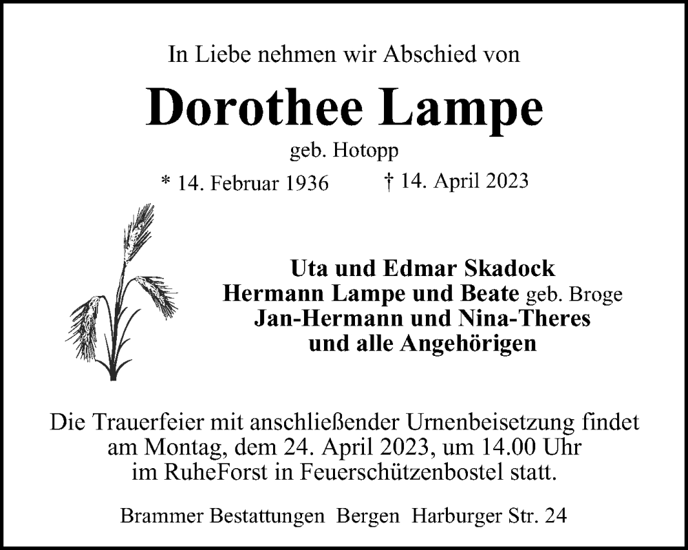 Hier finden Sie alle Traueranzeigen aus der Zeitung, die bisher für Dorothee Lampe erschienen sind. Weitere Traueranzeigen, die in der Zeitung erscheinen, werden hier ebenfalls aufgelistet