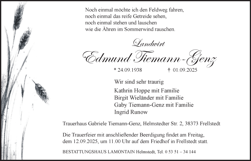 Hier finden Sie alle Traueranzeigen aus der Zeitung, die bisher für Edmund Tiemann-Genz erschienen sind. Weitere Traueranzeigen, die in der Zeitung erscheinen, werden hier ebenfalls aufgelistet
