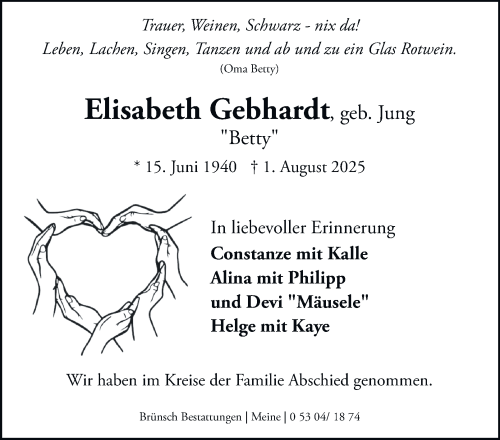 Hier finden Sie alle Traueranzeigen aus der Zeitung, die bisher für Elisabeth Gebhardt erschienen sind. Weitere Traueranzeigen, die in der Zeitung erscheinen, werden hier ebenfalls aufgelistet