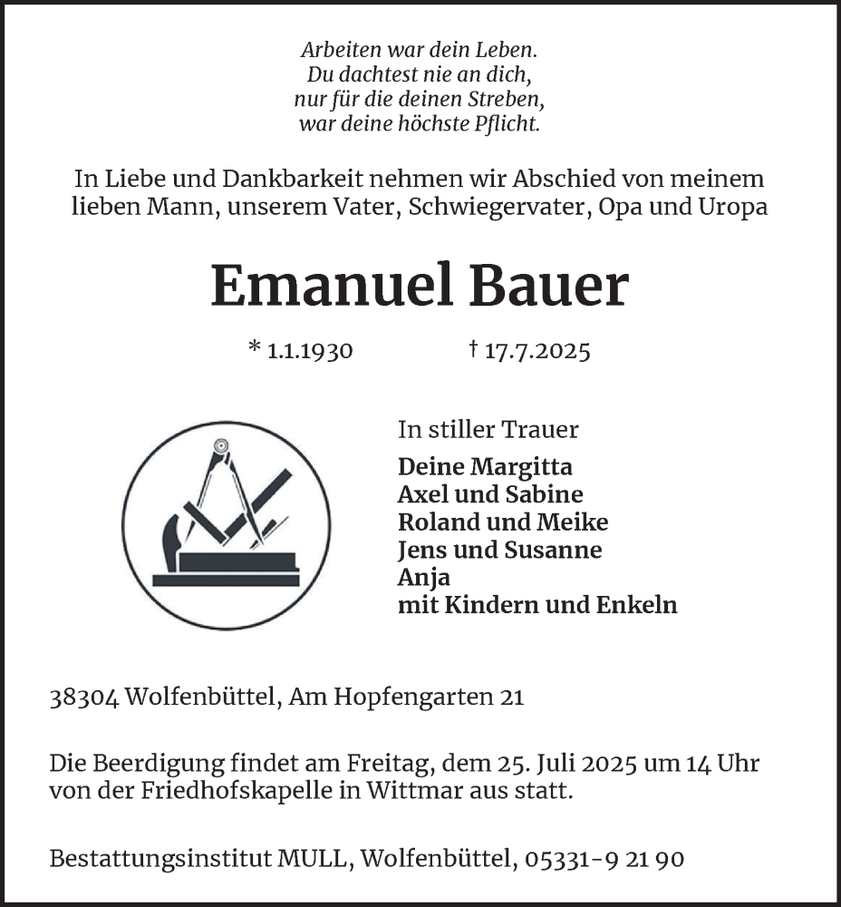 Hier finden Sie alle Traueranzeigen aus der Zeitung, die bisher für Emanuel Bauer erschienen sind. Weitere Traueranzeigen, die in der Zeitung erscheinen, werden hier ebenfalls aufgelistet