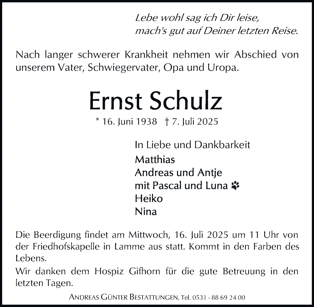 Hier finden Sie alle Traueranzeigen aus der Zeitung, die bisher für Ernst Schulz erschienen sind. Weitere Traueranzeigen, die in der Zeitung erscheinen, werden hier ebenfalls aufgelistet