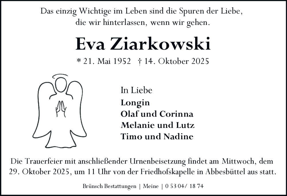 Hier finden Sie alle Traueranzeigen aus der Zeitung, die bisher für Eva Ziarkowski erschienen sind. Weitere Traueranzeigen, die in der Zeitung erscheinen, werden hier ebenfalls aufgelistet
