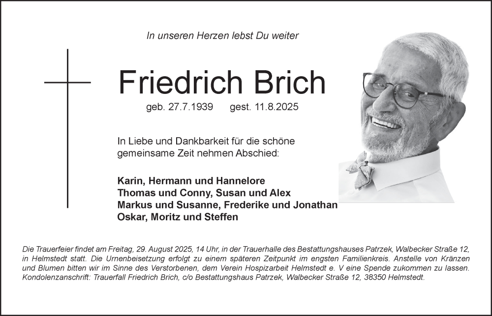 Hier finden Sie alle Traueranzeigen aus der Zeitung, die bisher für Friedrich Brich erschienen sind. Weitere Traueranzeigen, die in der Zeitung erscheinen, werden hier ebenfalls aufgelistet