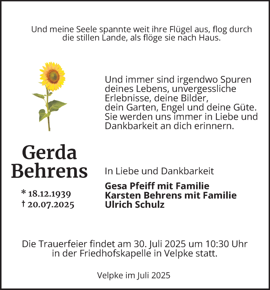 Hier finden Sie alle Traueranzeigen aus der Zeitung, die bisher für Gerda Behrens erschienen sind. Weitere Traueranzeigen, die in der Zeitung erscheinen, werden hier ebenfalls aufgelistet