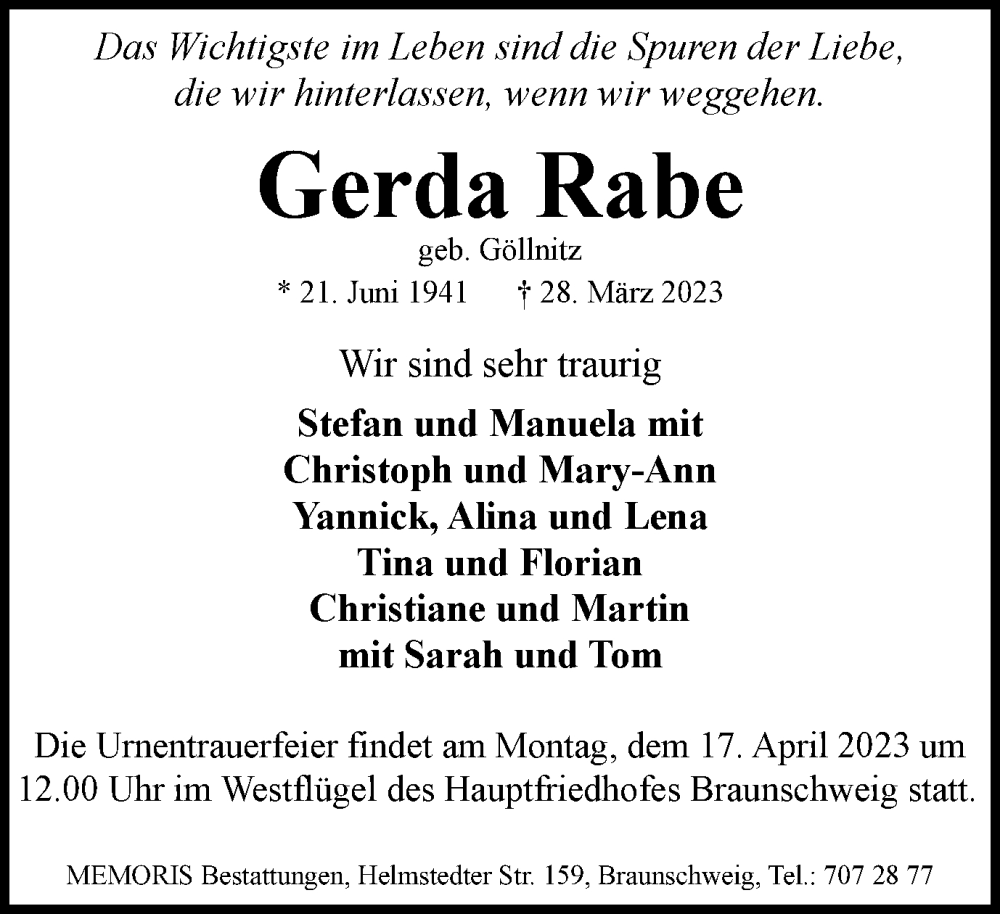 Hier finden Sie alle Traueranzeigen aus der Zeitung, die bisher für Gerda Rabe erschienen sind. Weitere Traueranzeigen, die in der Zeitung erscheinen, werden hier ebenfalls aufgelistet