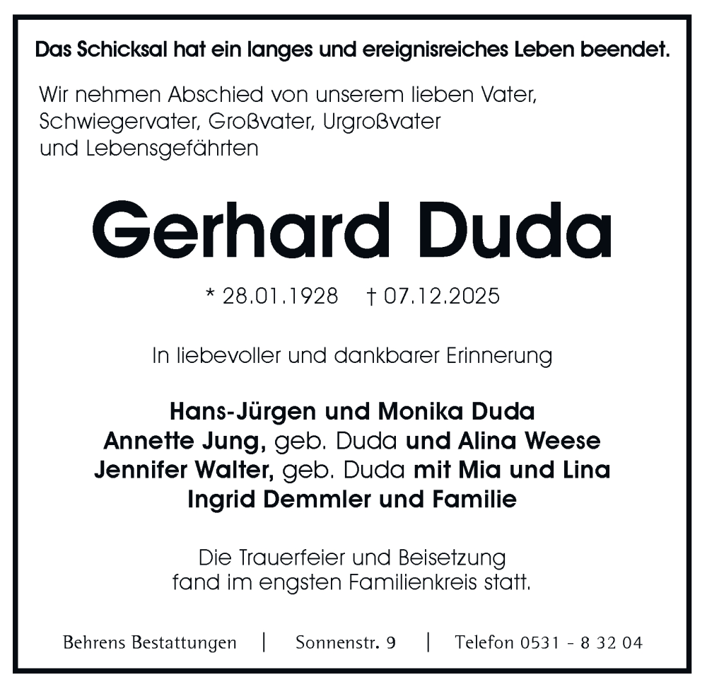 Hier finden Sie alle Traueranzeigen aus der Zeitung, die bisher für Gerhard Duda erschienen sind. Weitere Traueranzeigen, die in der Zeitung erscheinen, werden hier ebenfalls aufgelistet