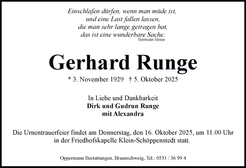 Hier finden Sie alle Traueranzeigen aus der Zeitung, die bisher für Gerhard Runge erschienen sind. Weitere Traueranzeigen, die in der Zeitung erscheinen, werden hier ebenfalls aufgelistet