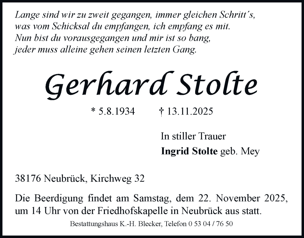Hier finden Sie alle Traueranzeigen aus der Zeitung, die bisher für Gerhard Stolte erschienen sind. Weitere Traueranzeigen, die in der Zeitung erscheinen, werden hier ebenfalls aufgelistet
