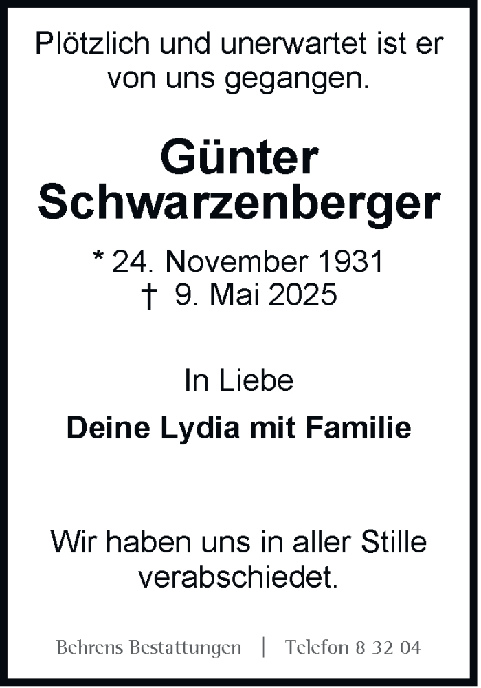 Hier finden Sie alle Traueranzeigen aus der Zeitung, die bisher für Günter Schwarzenberger erschienen sind. Weitere Traueranzeigen, die in der Zeitung erscheinen, werden hier ebenfalls aufgelistet