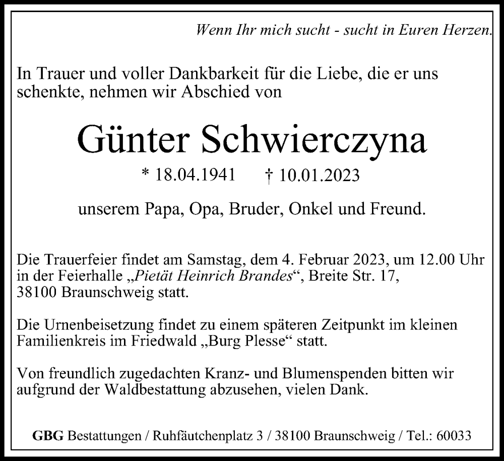 Hier finden Sie alle Traueranzeigen aus der Zeitung, die bisher für Günter Schwierczyna erschienen sind. Weitere Traueranzeigen, die in der Zeitung erscheinen, werden hier ebenfalls aufgelistet