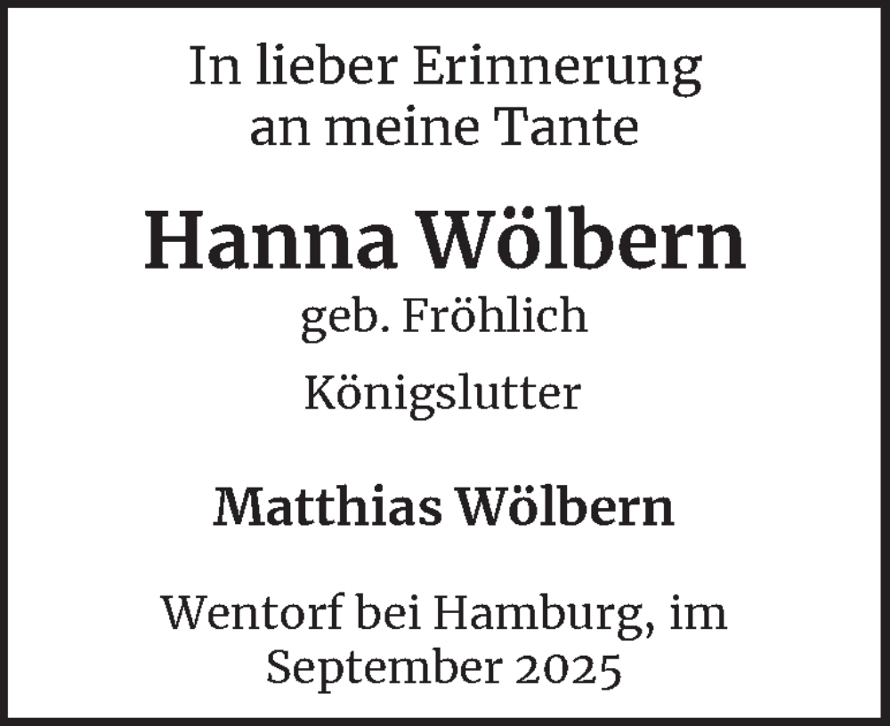 Hier finden Sie alle Traueranzeigen aus der Zeitung, die bisher für Hanna Wölbern erschienen sind. Weitere Traueranzeigen, die in der Zeitung erscheinen, werden hier ebenfalls aufgelistet