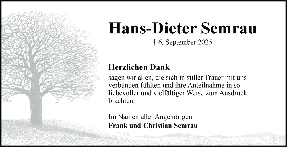 Hier finden Sie alle Traueranzeigen aus der Zeitung, die bisher für Hans-Dieter Semrau erschienen sind. Weitere Traueranzeigen, die in der Zeitung erscheinen, werden hier ebenfalls aufgelistet