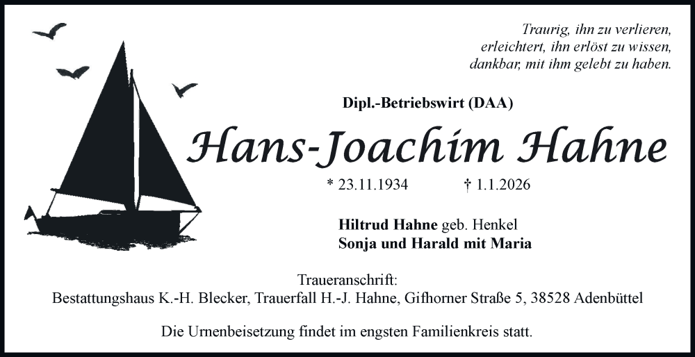 Hier finden Sie alle Traueranzeigen aus der Zeitung, die bisher für Hans-Joachim Hahne erschienen sind. Weitere Traueranzeigen, die in der Zeitung erscheinen, werden hier ebenfalls aufgelistet