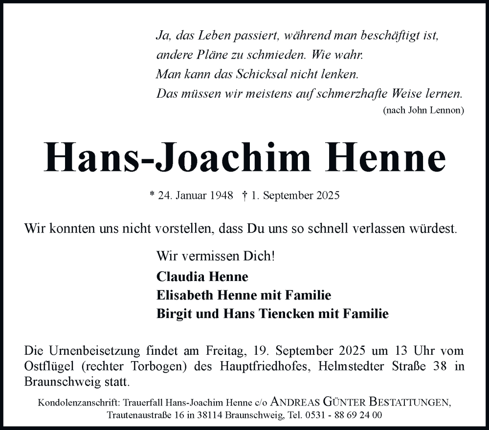 Hier finden Sie alle Traueranzeigen aus der Zeitung, die bisher für Hans-Joachim Henne erschienen sind. Weitere Traueranzeigen, die in der Zeitung erscheinen, werden hier ebenfalls aufgelistet
