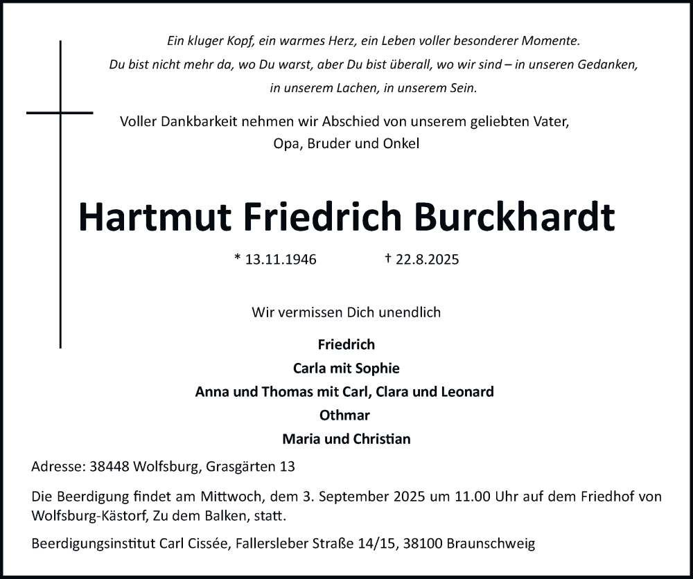 Hier finden Sie alle Traueranzeigen aus der Zeitung, die bisher für Hartmut Friedrich Burckhardt erschienen sind. Weitere Traueranzeigen, die in der Zeitung erscheinen, werden hier ebenfalls aufgelistet