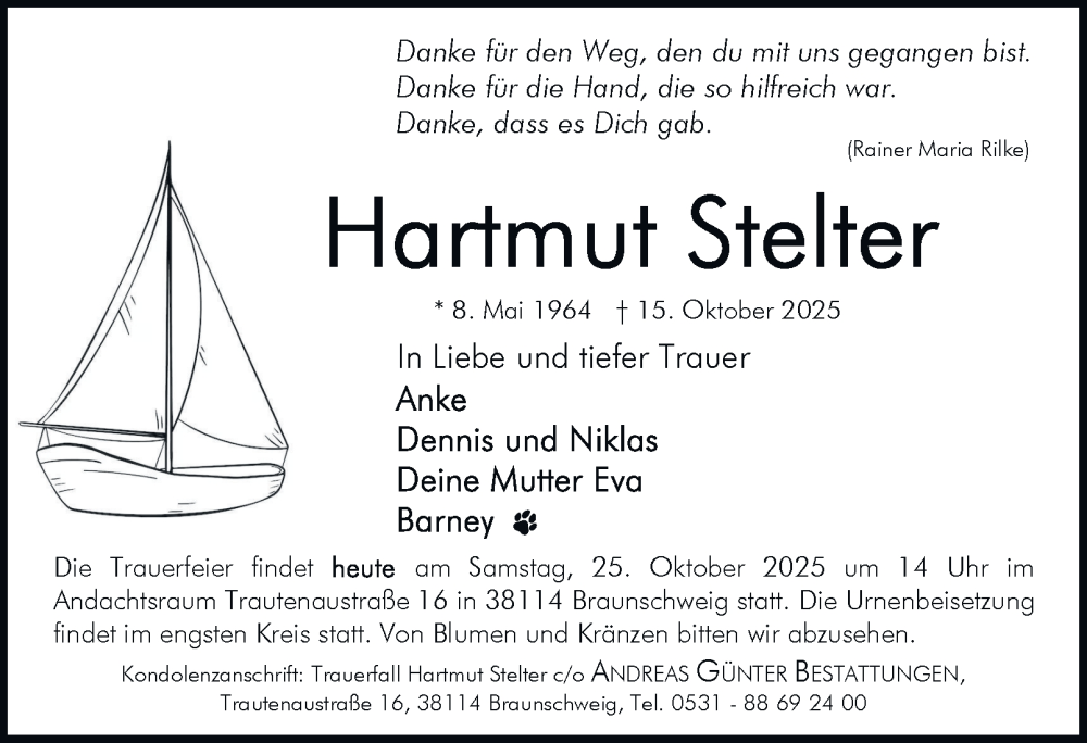 Hier finden Sie alle Traueranzeigen aus der Zeitung, die bisher für Hartmut Stelter erschienen sind. Weitere Traueranzeigen, die in der Zeitung erscheinen, werden hier ebenfalls aufgelistet