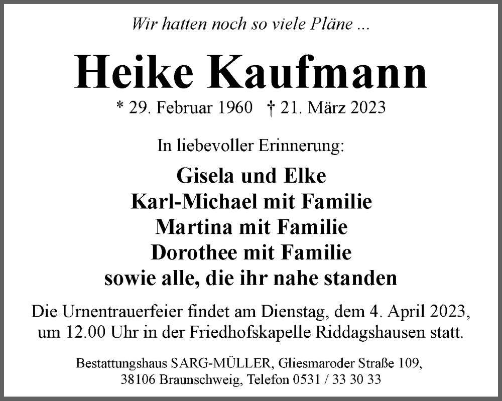 Hier finden Sie alle Traueranzeigen aus der Zeitung, die bisher für Heike Kaufmann erschienen sind. Weitere Traueranzeigen, die in der Zeitung erscheinen, werden hier ebenfalls aufgelistet