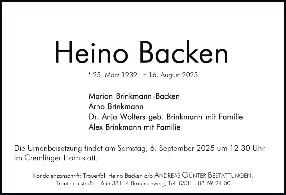 Hier finden Sie alle Traueranzeigen aus der Zeitung, die bisher für Heino Backen erschienen sind. Weitere Traueranzeigen, die in der Zeitung erscheinen, werden hier ebenfalls aufgelistet