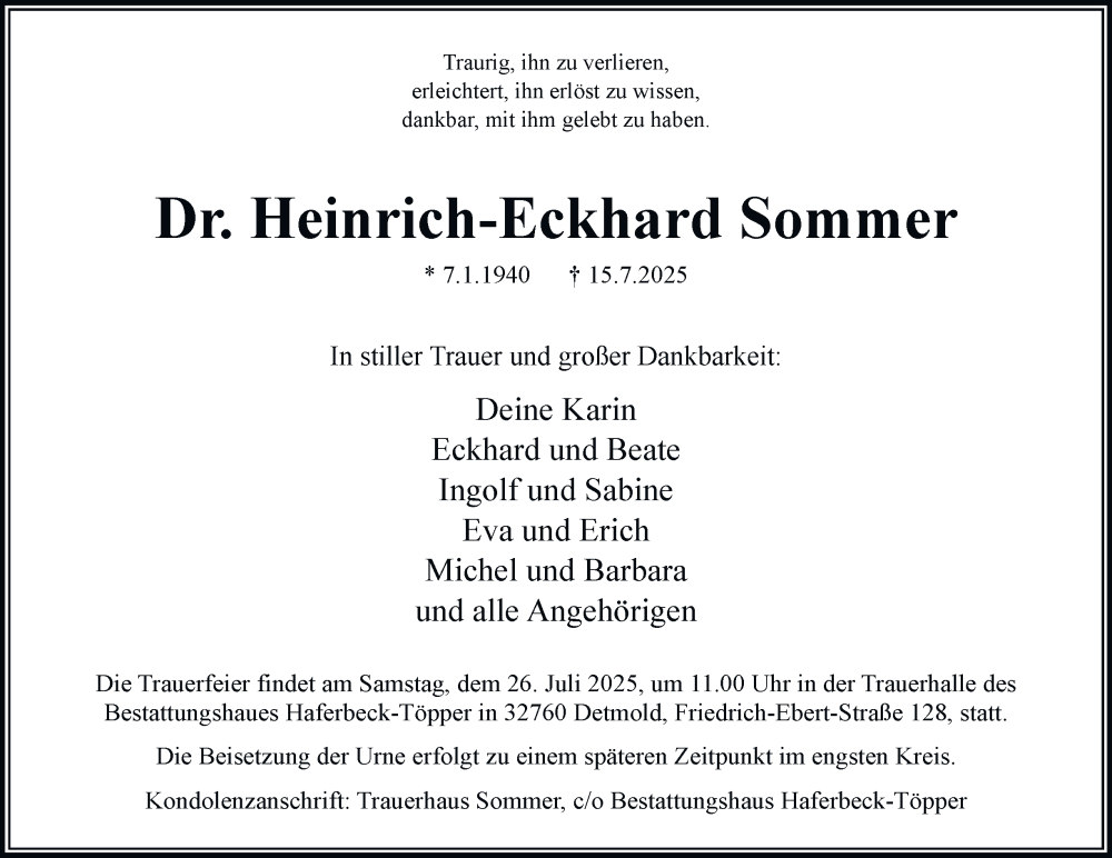 Hier finden Sie alle Traueranzeigen aus der Zeitung, die bisher für Heinrich-Eckhard Sommer erschienen sind. Weitere Traueranzeigen, die in der Zeitung erscheinen, werden hier ebenfalls aufgelistet