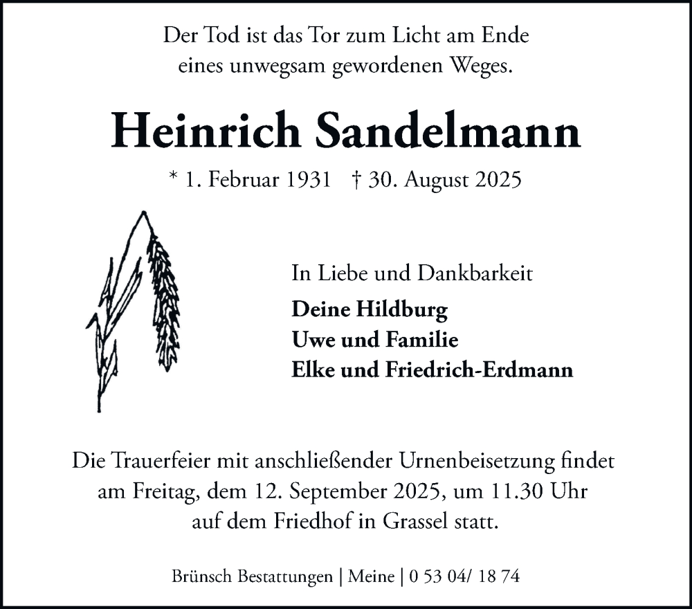 Hier finden Sie alle Traueranzeigen aus der Zeitung, die bisher für Heinrich Sandelmann erschienen sind. Weitere Traueranzeigen, die in der Zeitung erscheinen, werden hier ebenfalls aufgelistet