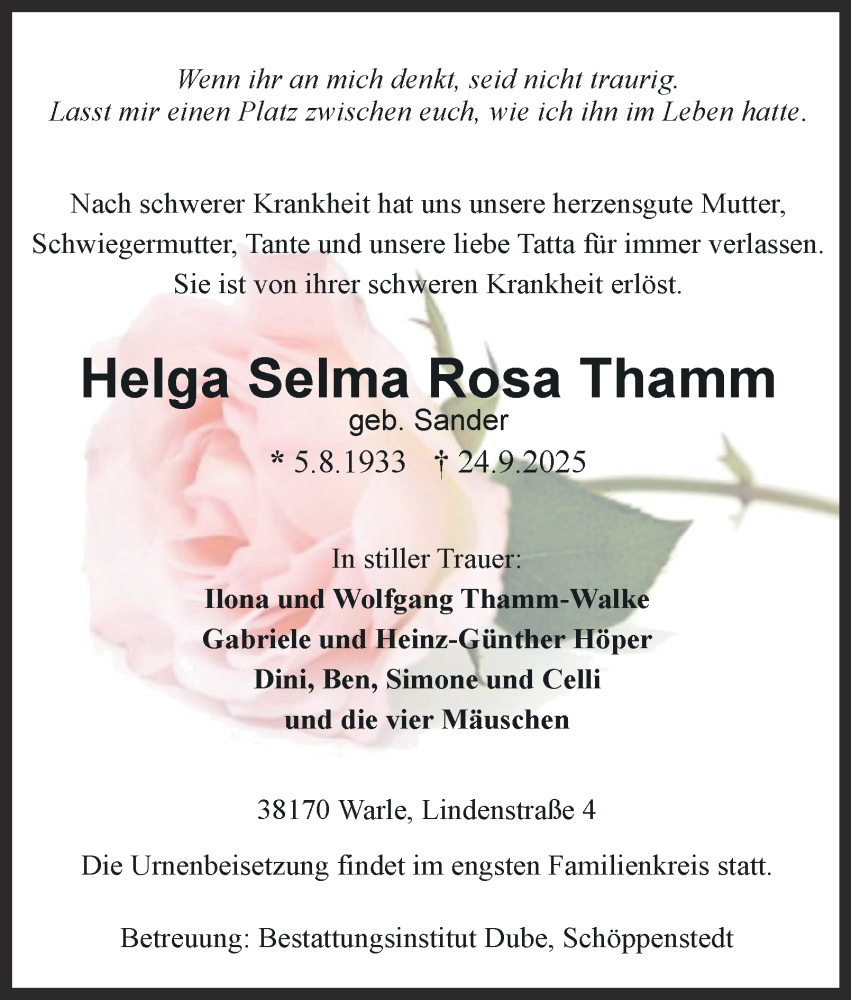 Hier finden Sie alle Traueranzeigen aus der Zeitung, die bisher für Helga Selma Rosa Thamm erschienen sind. Weitere Traueranzeigen, die in der Zeitung erscheinen, werden hier ebenfalls aufgelistet
