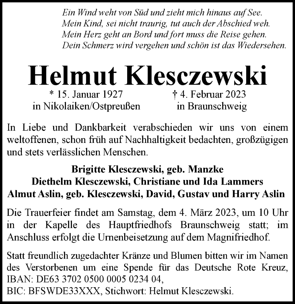 Hier finden Sie alle Traueranzeigen aus der Zeitung, die bisher für Helmut Klesczewski erschienen sind. Weitere Traueranzeigen, die in der Zeitung erscheinen, werden hier ebenfalls aufgelistet