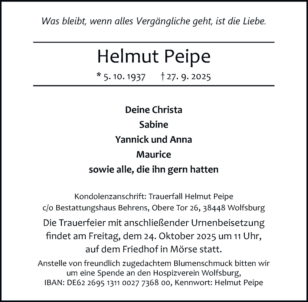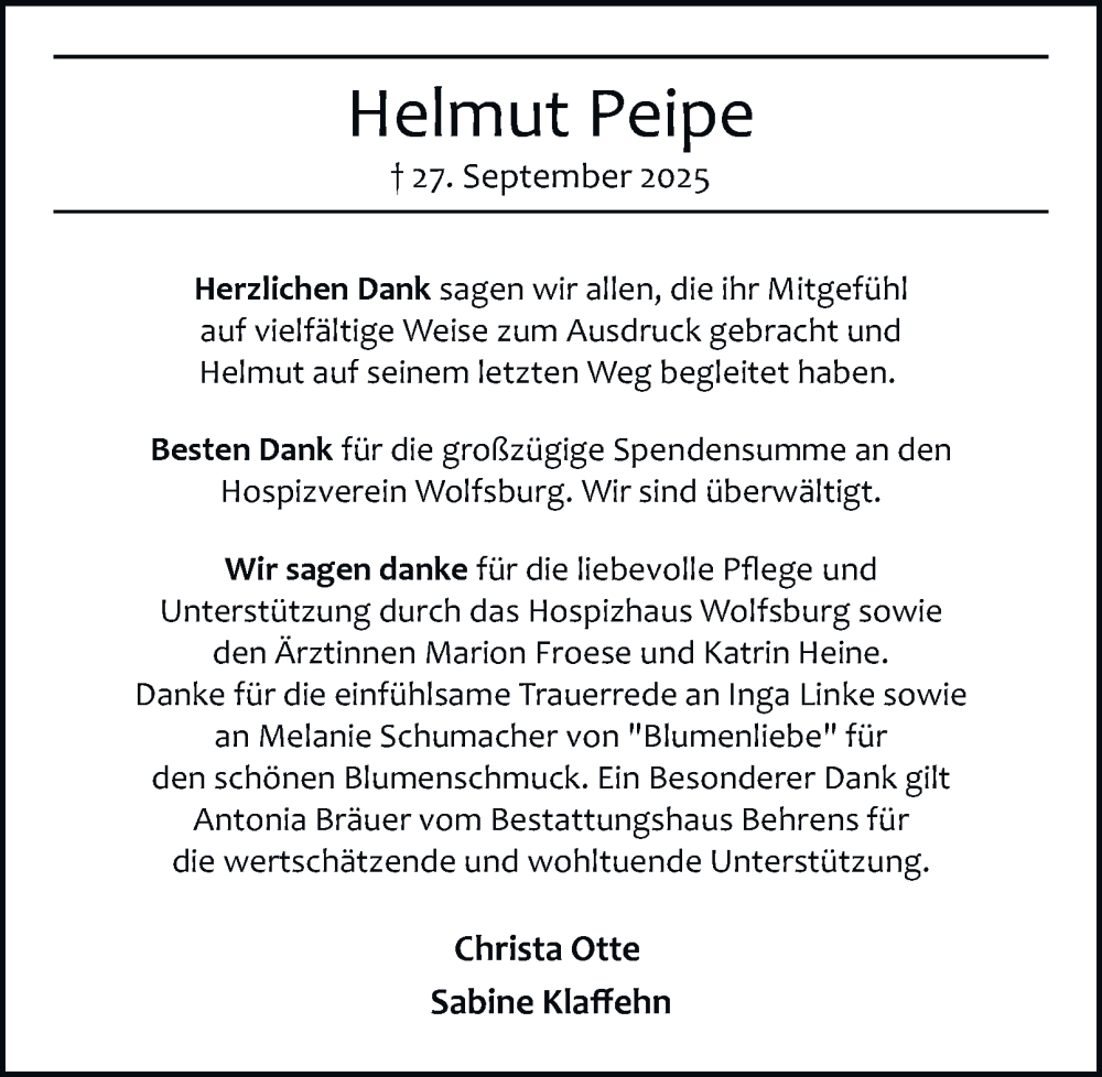 Hier finden Sie alle Traueranzeigen aus der Zeitung, die bisher für Helmut Peipe erschienen sind. Weitere Traueranzeigen, die in der Zeitung erscheinen, werden hier ebenfalls aufgelistet
