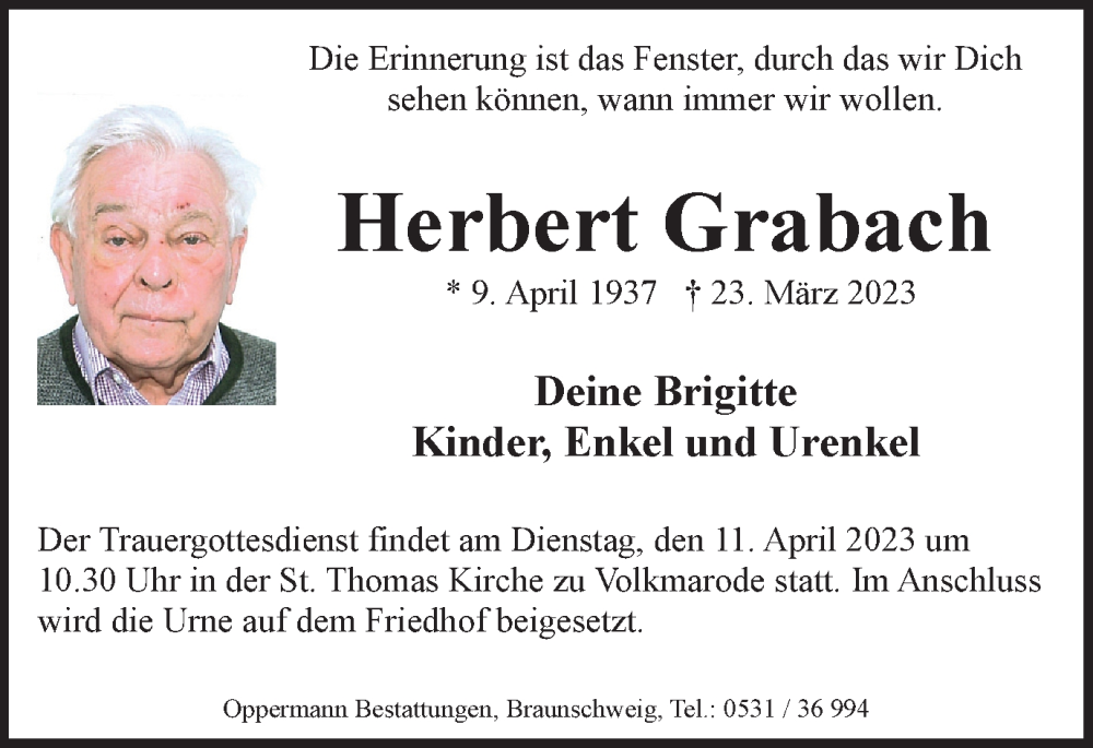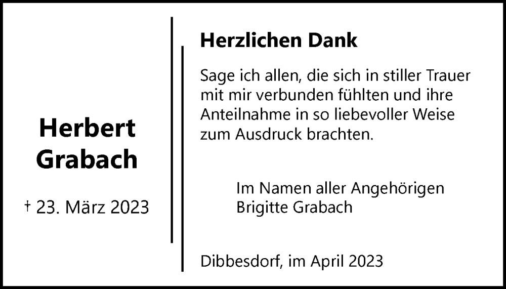 Hier finden Sie alle Traueranzeigen aus der Zeitung, die bisher für Herbert Grabach erschienen sind. Weitere Traueranzeigen, die in der Zeitung erscheinen, werden hier ebenfalls aufgelistet