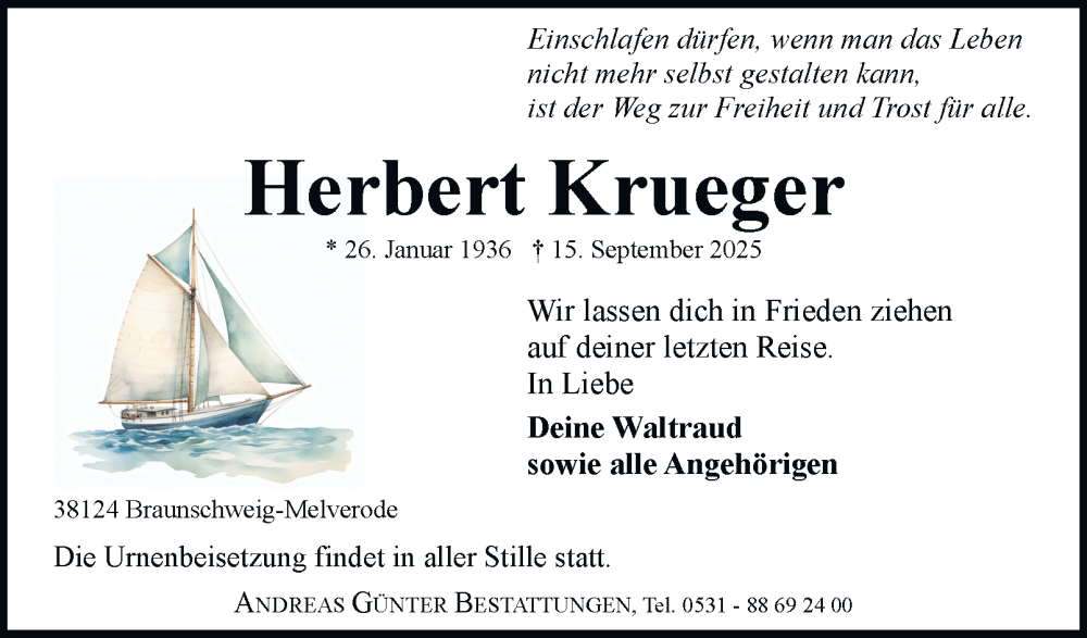 Hier finden Sie alle Traueranzeigen aus der Zeitung, die bisher für Herbert Krueger erschienen sind. Weitere Traueranzeigen, die in der Zeitung erscheinen, werden hier ebenfalls aufgelistet