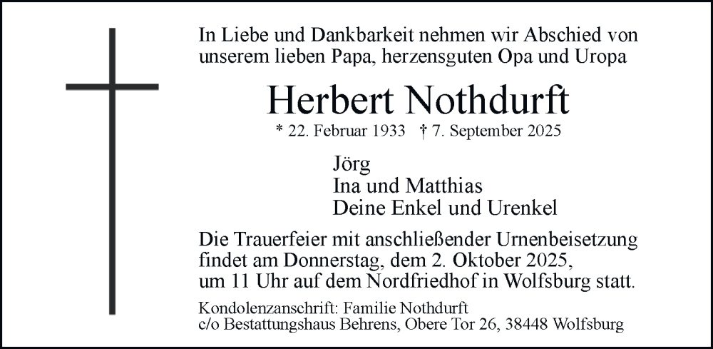 Hier finden Sie alle Traueranzeigen aus der Zeitung, die bisher für Herbert Nothdurft erschienen sind. Weitere Traueranzeigen, die in der Zeitung erscheinen, werden hier ebenfalls aufgelistet
