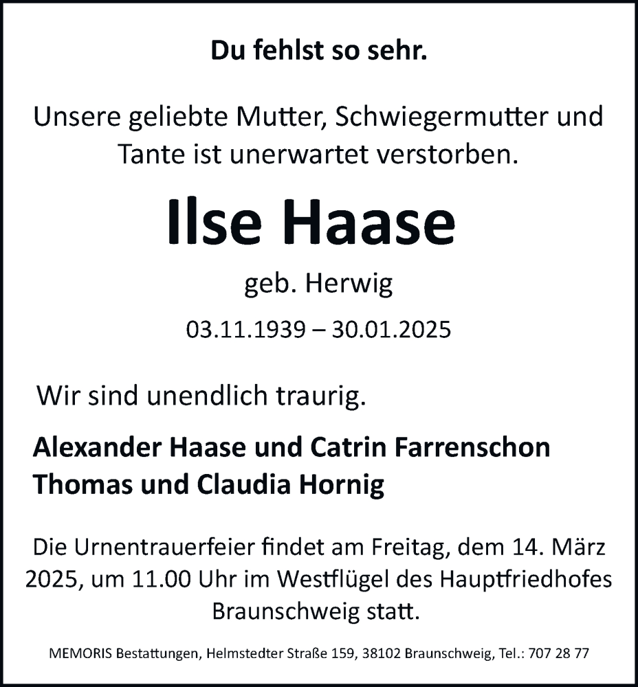 Hier finden Sie alle Traueranzeigen aus der Zeitung, die bisher für Ilse Haase erschienen sind. Weitere Traueranzeigen, die in der Zeitung erscheinen, werden hier ebenfalls aufgelistet