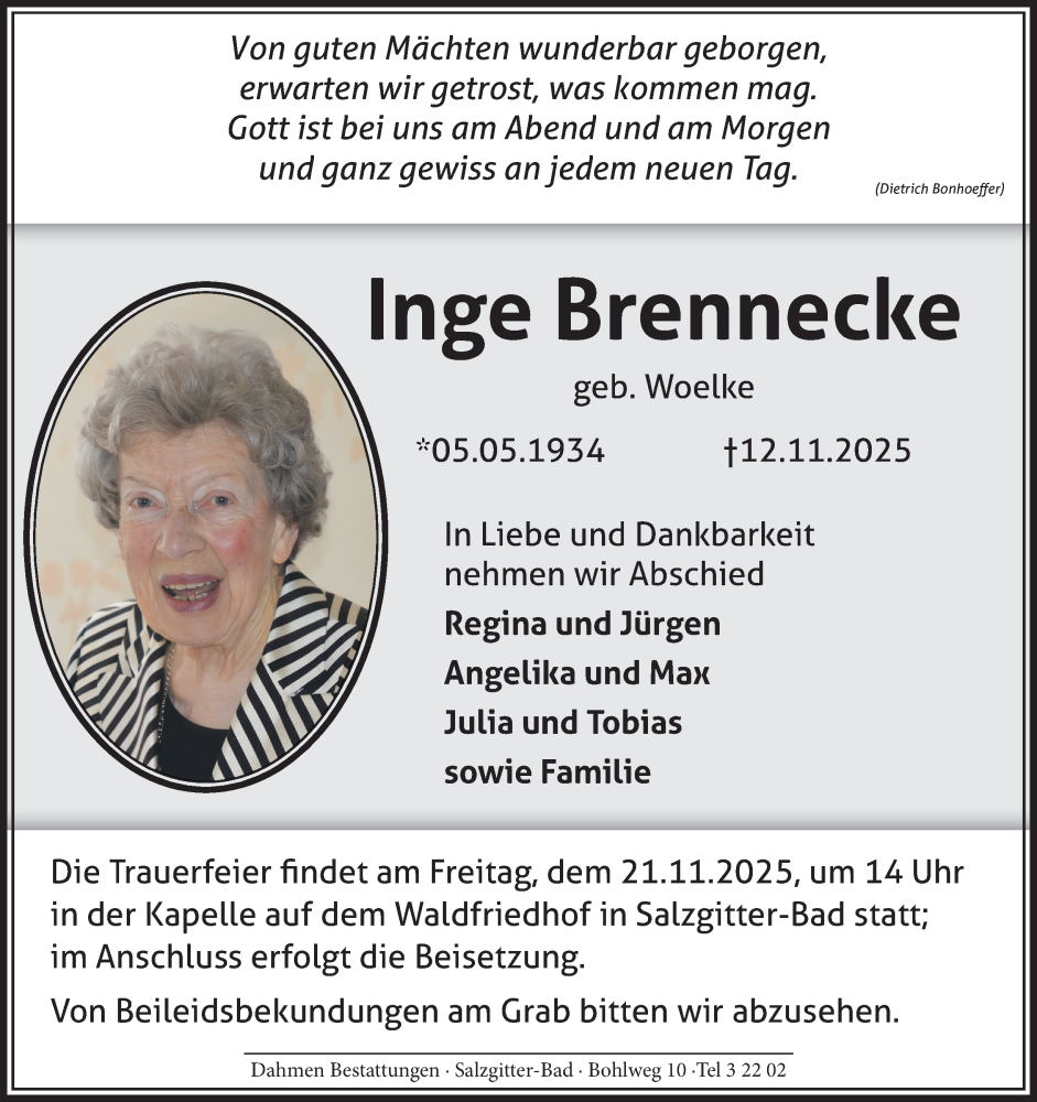 Hier finden Sie alle Traueranzeigen aus der Zeitung, die bisher für Inge Brennecke erschienen sind. Weitere Traueranzeigen, die in der Zeitung erscheinen, werden hier ebenfalls aufgelistet